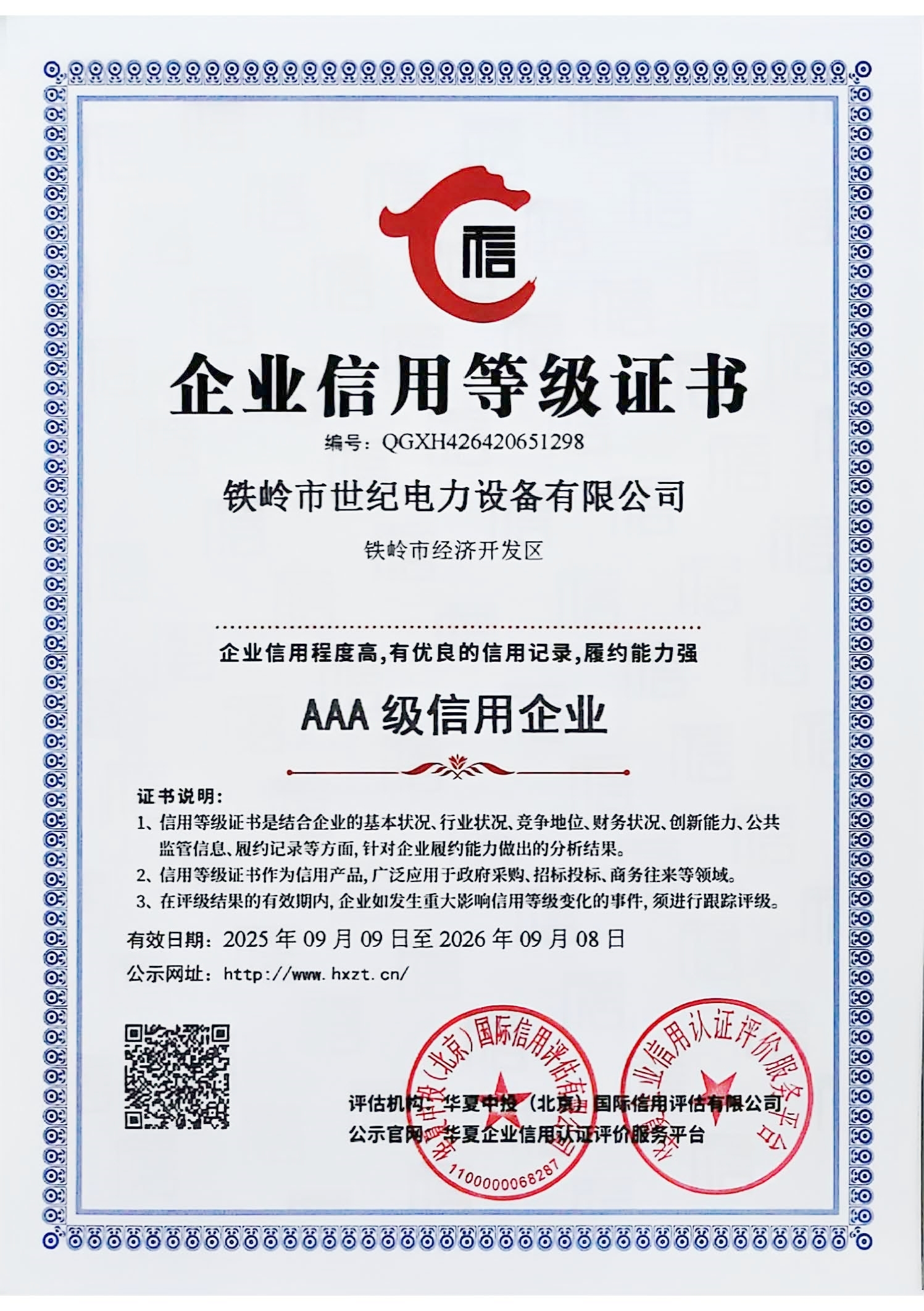 世紀電力AAA級信用證書